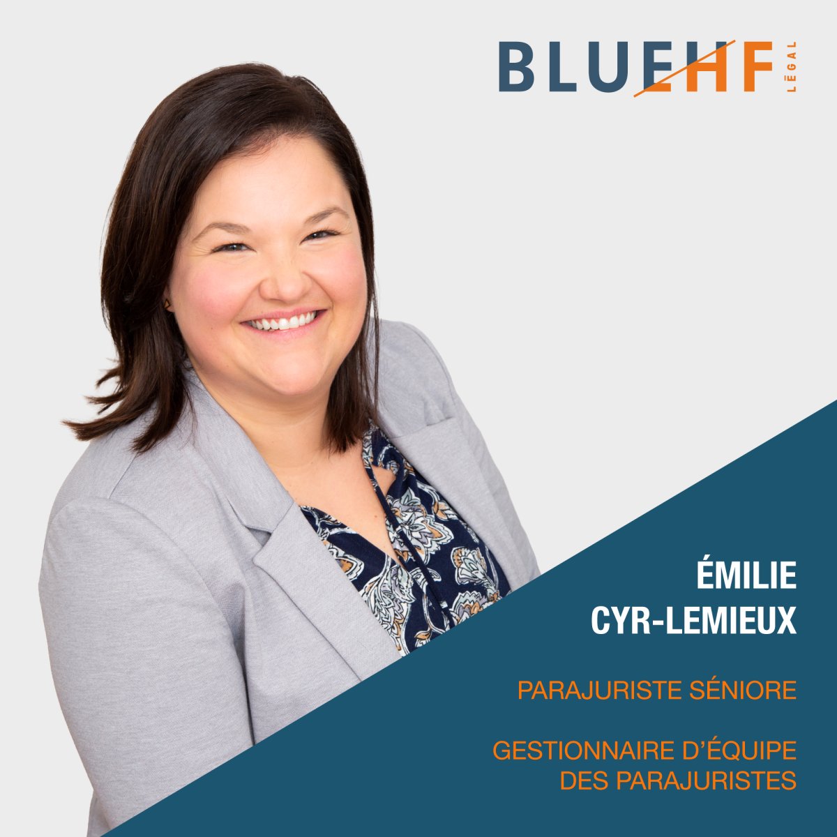 Émilie Cyr-Lemieux est parajuriste séniore et gestionnaire d’équipe des parajuristes au sein du cabinet Blue HF Légal s.e.n.c.r.l. (« BHF »), où elle joue un rôle clé dans la gestion et la coordination des dossiers juridiques ainsi que dans la mobilisation de l’équipe des parajuristes.